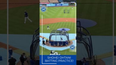 Shohei Ohtani hardly takes batting practice on the field, but did so during a Los Angeles Dodgers workout at Dodger…